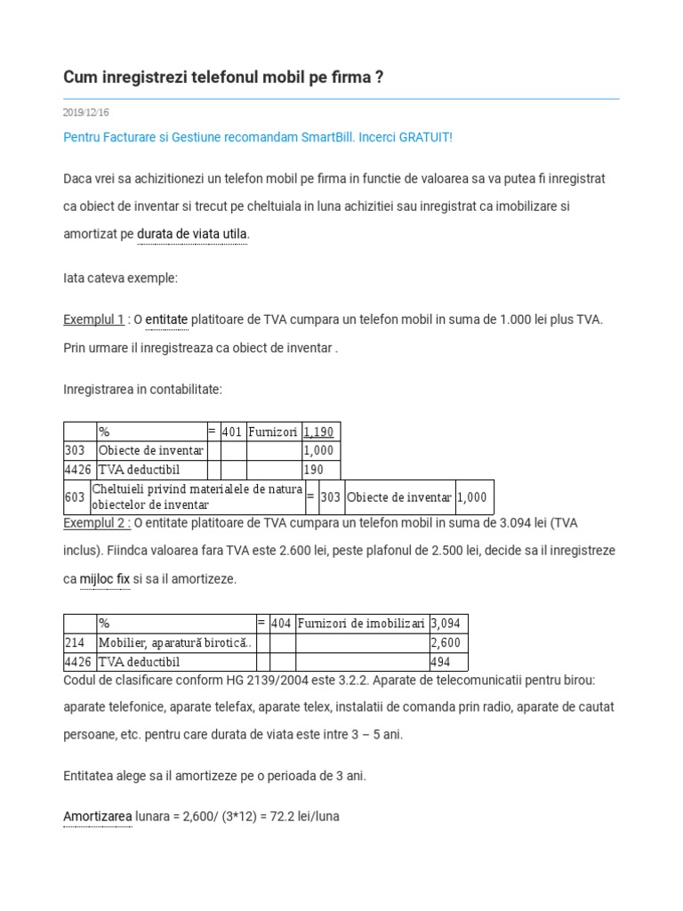 Obiectele de inventar sunt bunuri (active circulante) care au o durata de functionare mai mica de un an. Acestea sunt recunoscute în contabilitate drept o asadar, se împarte valoarea laptopului (2.700 lei) la 3 ani*12 luni = 36 luni și se obține o amortizare lunară de 75 lei. Din meniul operatii, selectam intrari, dam click pe.