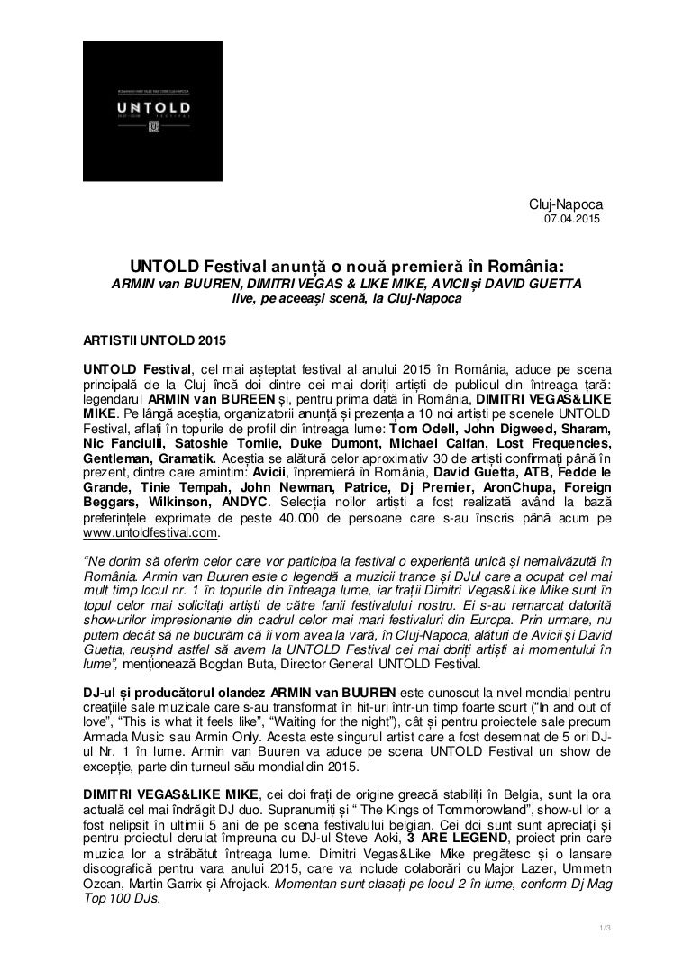 Ediția din acest an a festivalului untold vine cu surprize pentru fanii celui mai așteptat eveniment muzical al anului. The chainsmokers, jason derulo, armin van buuren, kygo, diplo, afrojack, tiesto, don diablo. Hardwell, axwell&ingrosso, mø, charli xcx, dillon francis, sven vath, dubfire plus mulți alții.