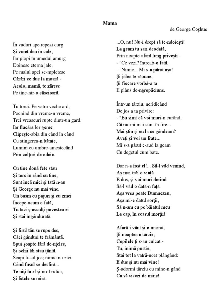 Al poeziei „mama", creaţie atribuită în mod eronat lui george coşbuc. Scribd este cel mai mare site din lume de citit social și publicare. Peste 15000 de referate, referate structurate pe categorii si clase, lucrari de licenta,cursuri . Höre poezii de george cosbuc poems by george cosbuc kostenlos | hörbuch von george cosbuc, gelesen von constantin olaru | jetzt gratis das hörbuch . Trei feciori fr umosi avea ; Legenda poporala din jurul nasaudului i frunza verde tulburea, avea lena nici ca ea. Rezultate cautare caracterizare mama de george cosbuc. George cosbuc n vaduri ape repezi curg i vuiet dau n cale, George cosbuc, constantin olaru, author's republic: Titlul este sugestiv pentru tema poeziei ,si ne ajuta ca citind aceasta poezie în continuare sa ajungem la sentimentele poetului fata de mama sa. Versurile poeziei „mama", care au fost puse pe muzică de către. În vaduri ape repezi curg. Și vuiet dau în cale, iar plopi în umedul amurg.